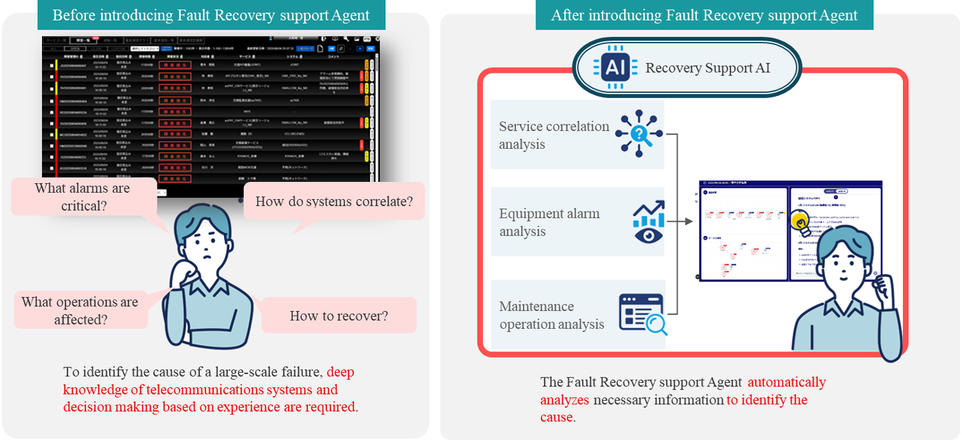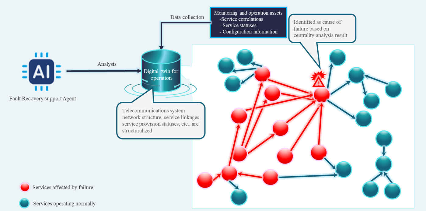 The AI Agent identifies the cause of a failure by comprehensively analyzing correlations between affected services and systems, equipment alarms that were issued, maintenance operations that were conducted, etc. Structurization of the information of each service's networks and systems enables the AI Agent to analyze it. This allows operation staff to easily identify the cause of a complicated failure that affects multiple systems.