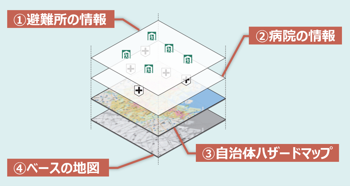 雨雲レーダーやライブカメラ映像、避難所情報などの災害関連情報から、各自治体特有の課題や、地震豪雨など災害の特徴にあわせて必要な情報を選択し、1つの地図上に可視化するサービスです。