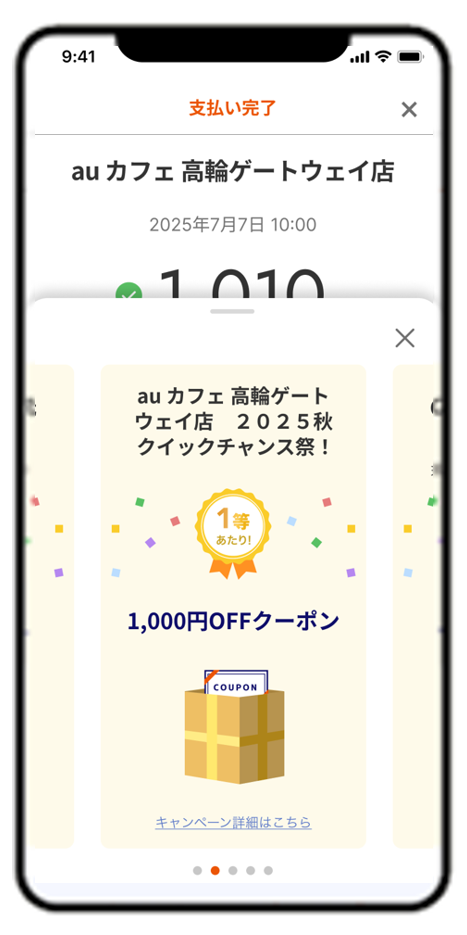 - 決済完了後に即時で抽選結果が分かり、次回以降にau PAY決済で使えるクーポンを獲得できます。
