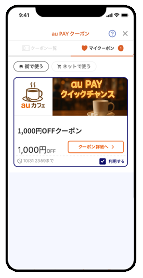 - クーポン特典はau PAY アプリのマイクーポンに自動で格納されるため、追加の操作などは必要ありません。
