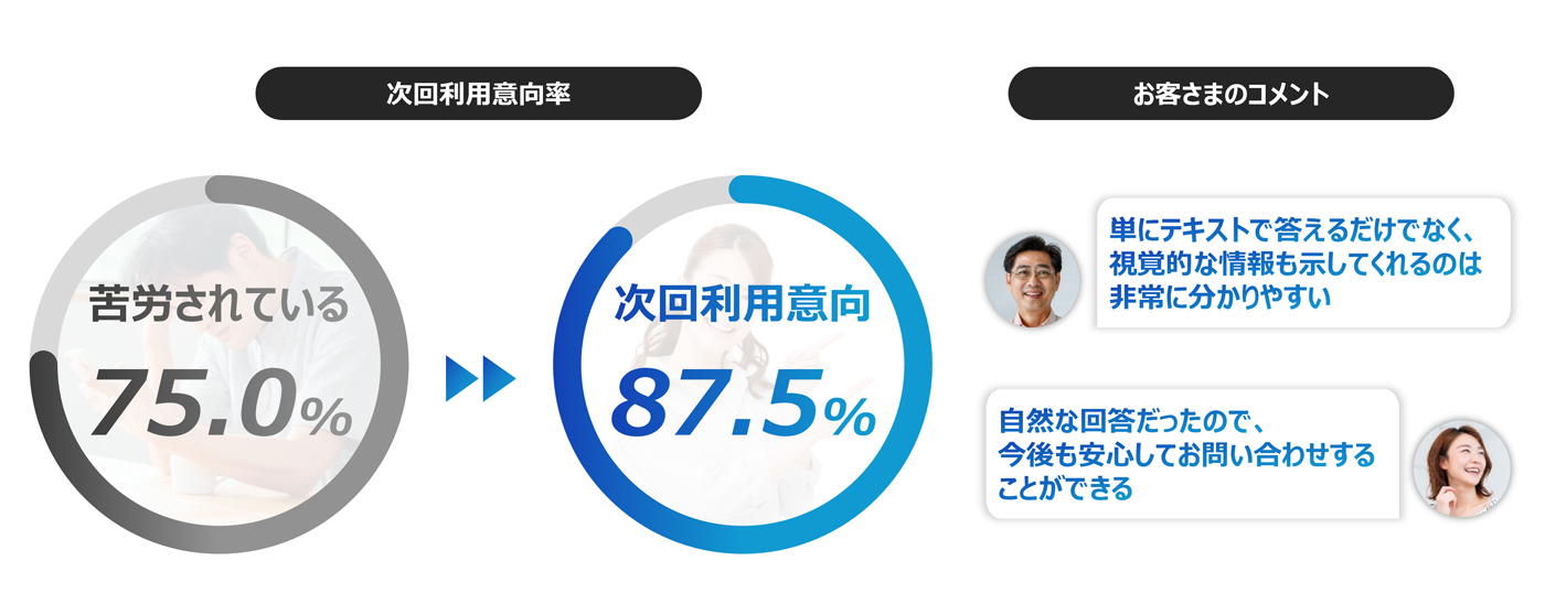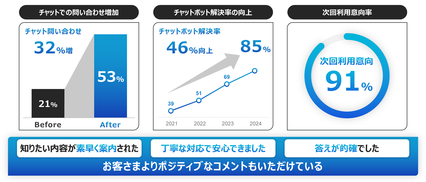 これらの取り組みを通じて、解決率は85%まで向上。利用率は50%超、チャットでの問い合わせ件数も32%増加し、次回利用意向率は91%に達するなどの成果を創出しました。