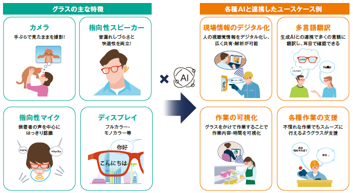 使用するAIグラスは、スリムで装着負荷が少ないスマートグラスとAIを組み合わせたものです。現場でハンズフリーでの情報収集と音声・テキスト・映像での作業サポートが可能であり、AIによる省人化と組み合わせることで労働力不足解消の新しいDXツールとして期待されています。