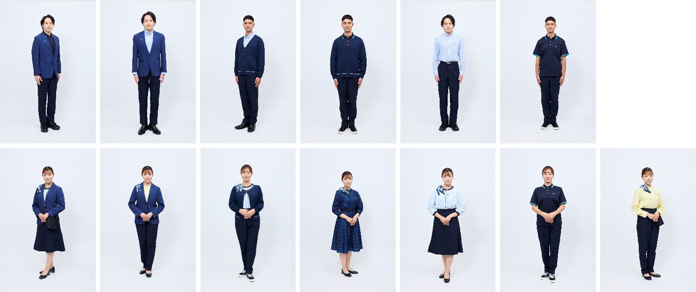 デザイン面では、KDDIブルーをイメージしたネイビーを基調に、明るく健康的な印象を与えるイエローなどのアクセントカラーを取り入れ、親しみやすさと信頼性を表現しています。さらに、ワンピース風にも着こなせるプリント柄のセットアップなど、新たなアイテムを導入し、スタッフ一人ひとりの個性や多様なコーディネートを楽しめるよう工夫しました。