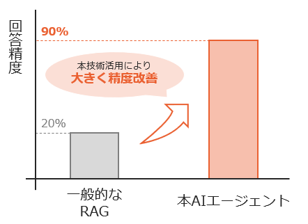 AIで応対文を生成する際の一般的な手法として、RAG(Retrieval-Augmented Generation)が知られています。RAGはマニュアルを参照することで回答可能な簡単な質問に対して、定型的に回答する場合などでは高い精度を示します。しかし、本AIエージェントの対象である、AIチャットボットで対応しきれない難易度の高い質問に対して、単純にRAGを適用した場合の回答精度は約20%に留まります。これは、難易度の高い質問に回答するためには、スタッフの暗黙知を考慮した上で自律的に情報収集する必要がある一方で、複数のマニュアルを参照する中で情報が混合し、ハルシネーションが発生するためです。