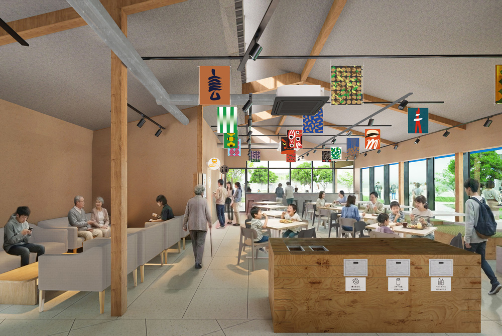 注1)を設置するほか、地域の皆さまの交流・ワークショップ・イベント開催などにもご利用いただける「小上がりのある広いカフェスペース」や「屋内広場」を設置します。