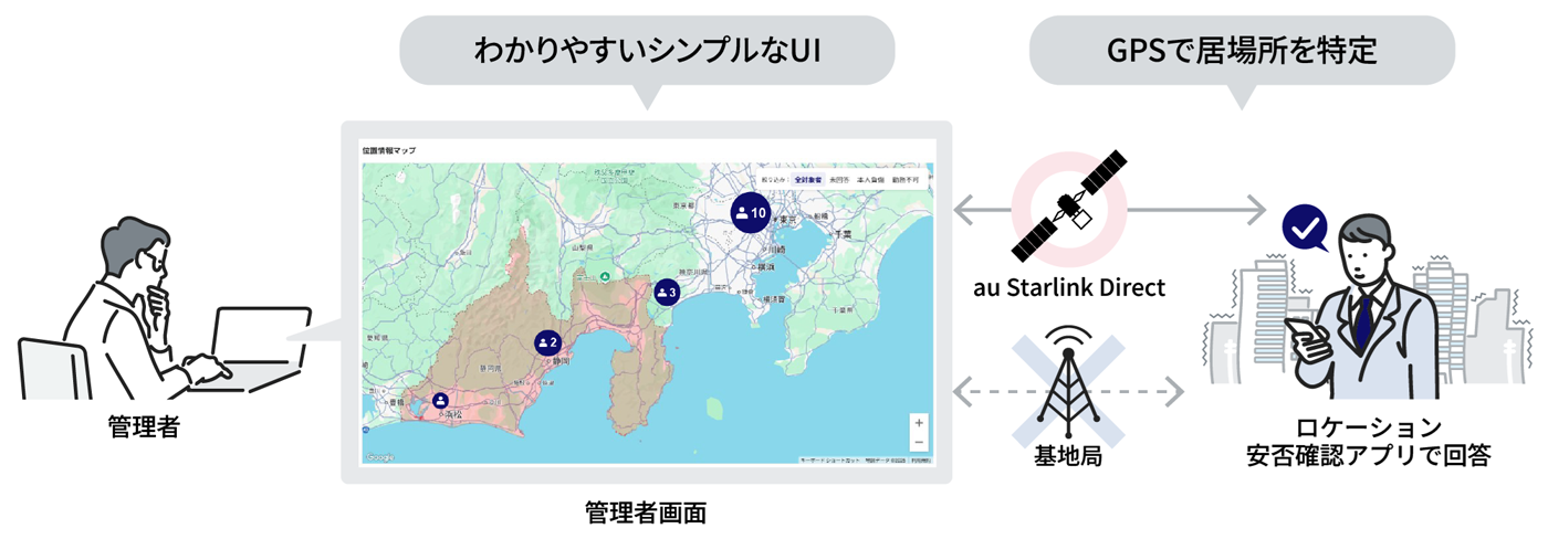 - auをご利用の場合、圏外エリアなど通信環境が無い状況でも、「au Starlink Direct」を通じて安否回答や従業員の回答状況の確認が可能です。