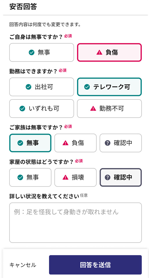 - 安否回答依頼が届いた従業員はスマートフォンのアプリ上で、ご自身の状況を選択するだけで回答可能です。