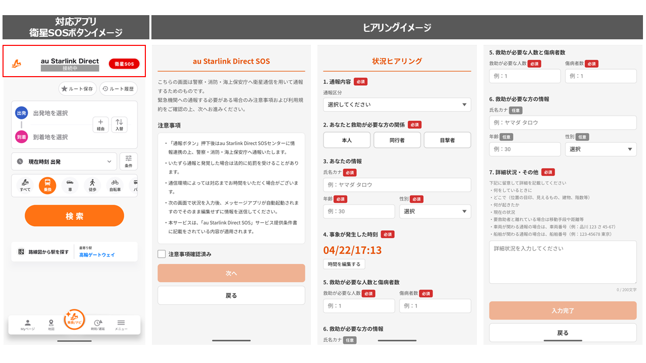「au Starlink Direct SOSセンター」では、あらかじめ被救助者の状態や周辺状況などを入力いただくことで、救助に必要な情報を整理し、緊急通報受理機関へ円滑につなげることを想定しています。圏外における迷子から不慮の怪我・事故など、さまざまな利用シーンにおいて、お子さまから大人の方まで幅広い年代の方にご利用いただけます。