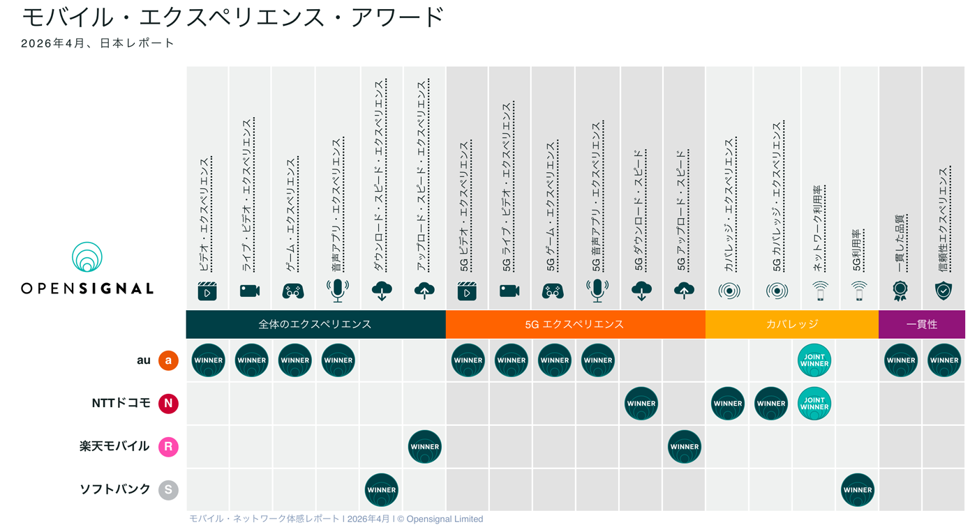 KDDI、沖縄セルラー(powered by the KDDI network)は、グローバル分析会社Opensignal社が2026年4月23日に発表した、日本市場の「モバイル・ネットワーク・ユーザー体感レポート」(以下 本レポート)(