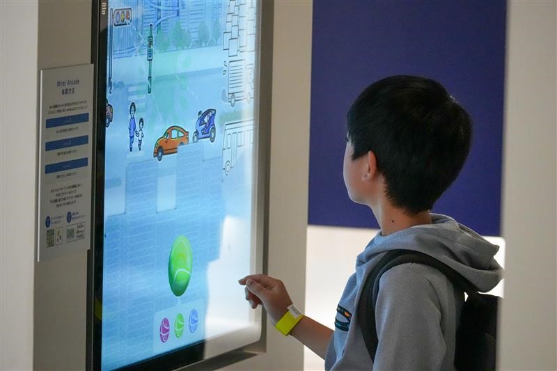 2025年に開催された大阪・関西万博の展示物「Mirai Arcade」を再現。タッチパネル上の「ミライボール」を投げて未来を変える体験ができるゲーム形式のコーナーです。