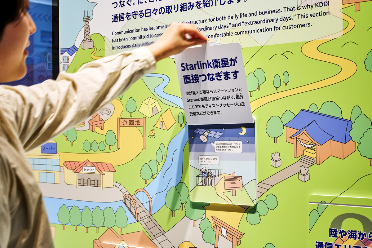 KDDIの自然災害への取り組みをご紹介するコーナーです。お子さまにも興味を持っていただけるように、めくりパネルで解説します。